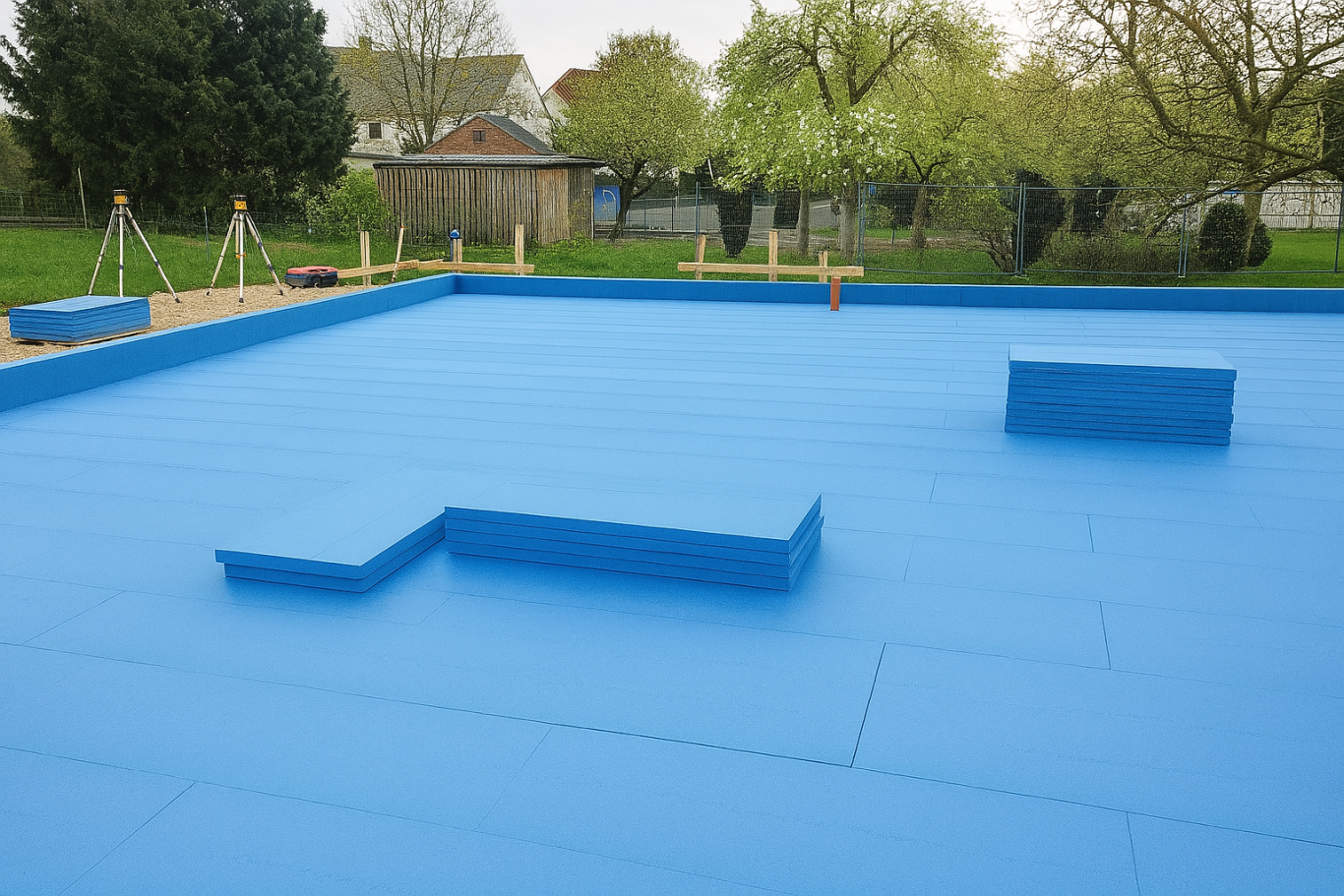 Die Bodenplatte wird auf lastabtragender XPS-Dämmung ausgeführt. Dadurch entsteht eine wärmebrückenarme, energieeffiziente Konstruktion – auch bei großen Hallenflächen.